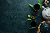 Zestaw czarnej, zielonej, owocowej i ziołowej herbaty na czarnym kamiennym tle. Herbata w czajniczku i filiżance. Widok góry. wolne miejsce na tekst.