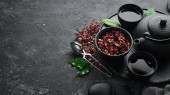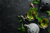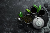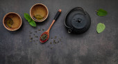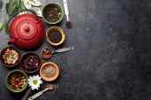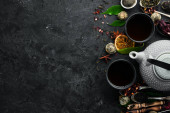 Zdjęcie "Zestaw czarnej, zielonej, owocowej i ziołowej herbaty na czarnym kamiennym tle. Herbata w czajniczku i filiżance. Widok góry. wolne miejsce na tekst." może być wykorzystywane do celów osobistych i komercyjnych zgodnie z warunkami zakupionej licencji Royalty-free. Obraz jest dostępny do pobrania w jakości wysokiej rozdzielczości do 5760x3840.