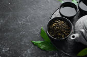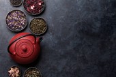 Zestaw czarnej, zielonej, owocowej i ziołowej herbaty na czarnym kamiennym tle. Herbata w czajniczku i filiżance. Widok góry. wolne miejsce na tekst.