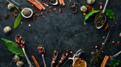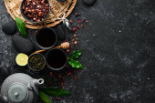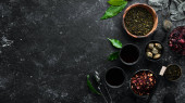 Zdjęcie "Zestaw czarnej, zielonej, owocowej i ziołowej herbaty na czarnym kamiennym tle. Herbata w czajniczku i filiżance. Widok góry. wolne miejsce na tekst." może być wykorzystywane do celów osobistych i komercyjnych zgodnie z warunkami zakupionej licencji Royalty-free. Obraz jest dostępny do pobrania w jakości wysokiej rozdzielczości do 5760x3840.