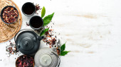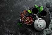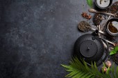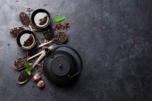Zestaw czarnej, zielonej, owocowej i ziołowej herbaty na czarnym kamiennym tle. Herbata w czajniczku i filiżance. Widok góry. wolne miejsce na tekst.
