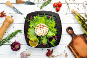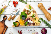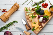 Różne sery. Zestaw sera, orzechów i winogron. Widok góry. Wolna przestrzeń do kopiowania.