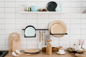 Półka z elementami dekoracyjnymi w salonie w domu. Skandynawski minimalistyczny styl we wnętrzu