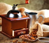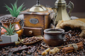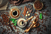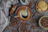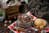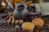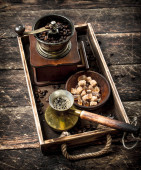 Ziarna kawy są pieczone na patelni z dymem.