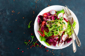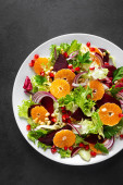 Sałatka świąteczna z gotowanymi burakami, czerwoną cebulą, mandarynkami, granatem, pietruszką, orzechami sosnowymi i liśćmi sałaty
