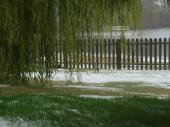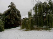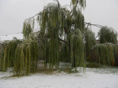 Szerokie ujęcie wierzby w pobliżu stawu pokrytego lodami w zimie
