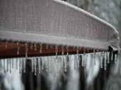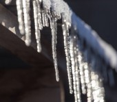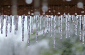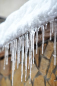 Zbliżenie sople wiszące zamrożone z czubka dachu huśtawki na zewnątrz w zimie