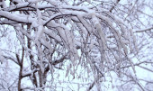 Zasłona liści wierzby całkowicie pokryta lodem w zimie