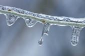 Zbliżenie sople wiszące zamrożone z gałęzi gałązki pokryte śniegiem
