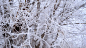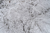 Piękny splot gałęzi i gałązek pokrytych śniegiem i lodem w chłodny zimowy poranek