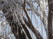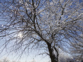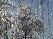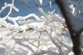 Drzewo gałęzie i gałązki pokryte lodem i śniegiem, z bokeh i błękitne niebo w tle