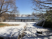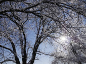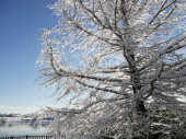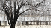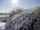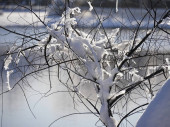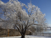 Wierzba pokryta lodem i śniegiem przy drewnianym ogrodzeniu