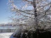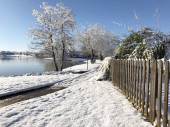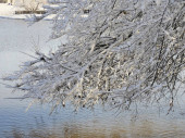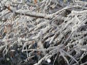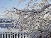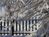 Ukierunkowane ujęcie gałązek i gałęzi pokrytych lodem i śniegiem, z zamglonym płotem pokrytym śniegiem