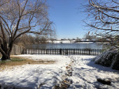 Szeroki widok na staw, z ziemią pokrytą świeżym śniegiem