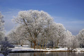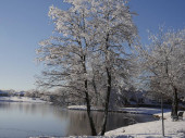 Piękny widok nad stawem w zimowy poranek, z kaczkami w tle