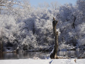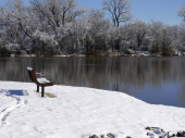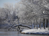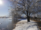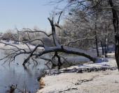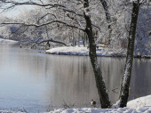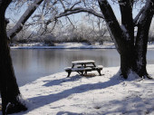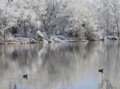 Zimowa scena w parku nad stawem, z drzewami i ławkami pokrytymi lodem i śniegiem