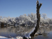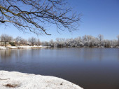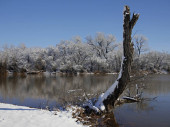Blisko pniaka częściowo pokrytego śniegiem stojącym nad stawem w piękny zimowy poranek