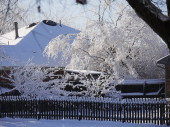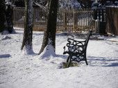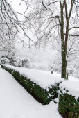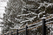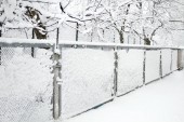 Śnieg pokrywa ziemię wokół drzew i drewnianych ogrodzeń parku