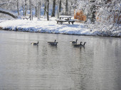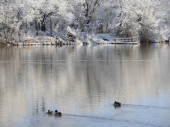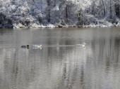Kaczki stojące i pływające na brzegu stawu w śnieżny dzień