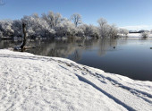 Trzy kaczki pływające w zimnej wodzie stawu w zimowy poranek