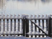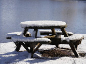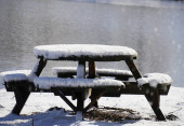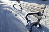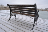 Widok z tyłu pokrytej śniegiem stalowej ławki z widokiem na staw w mroźny zimowy poranek