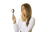 zdziwiony dziewczyna wygląda przez szkło powiększające