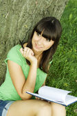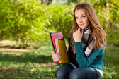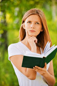 Młoda piękna dziewczyna siedzi na most i czyta książki