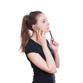 Zdjęcie "Profil młoda kobieta, która mówi przez telefon" może być wykorzystywane do celów osobistych i komercyjnych zgodnie z warunkami zakupionej licencji Royalty-free. Obraz jest dostępny do pobrania w jakości wysokiej rozdzielczości do 5760x3840.