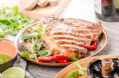 Zdjęcie "soczysty duży kawałek grillowanej ryby siedzi na kwadratowej czarnej płycie. Obok słoika ze specjalnym sosem, plasterek limonki, szpinaku, pomidorów. Talerz jest na białym kawałku papieru do pakowania.. " może być wykorzystywane do celów osobistych i komercyjnych zgodnie z warunkami zakupionej licencji Royalty-free. Obraz jest dostępny do pobrania w jakości wysokiej rozdzielczości do 5760x3840.