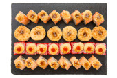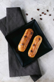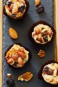 Małe mini tarty z rodzynkami i orzechami na okrągłej czarnej tablicy kamiennej na czarno w niskim kluczu.