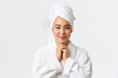 Zdjęcie "Portret młodej szczęśliwej azjatyckiej damy w szlafroku.Odizolowany w białym tle." może być wykorzystywane do celów osobistych i komercyjnych zgodnie z warunkami zakupionej licencji Royalty-free. Obraz jest dostępny do pobrania w jakości wysokiej rozdzielczości do 5760x3840.
