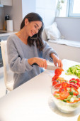 Gladsome gospodyni domowa robi sałatkę i uśmiechnięte zdjęcie