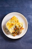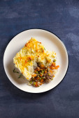 Shepherd 's Pie lub Cottage Pie na talerzu, szare tło. Zdjęcie poziome nad głową