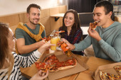 Grupa przyjaciół o zabawy party z pyszną pizzą w kawiarni