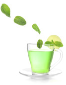 przezroczyste filiżankę zielonej herbaty z szałwią i lipa na białym tle
