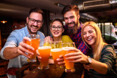 Grupa przyjaciół oglądających piłkę nożną w barze sportowym