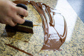Cukiernik w rękawiczkach robi czekoladki w postaci