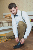 Dłonie ostrożnej, młodej córki pomagającej choremu ojcu siedzieć na kanapie i wiązać sznurowadła na brązowych butach przed wyjściem.