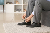 Zdjęcie "Dłonie ostrożnej, młodej córki pomagającej choremu ojcu siedzieć na kanapie i wiązać sznurowadła na brązowych butach przed wyjściem." może być wykorzystywane do celów osobistych i komercyjnych zgodnie z warunkami zakupionej licencji Royalty-free. Obraz jest dostępny do pobrania w jakości wysokiej rozdzielczości do 5760x3840.