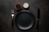 Pusty talerz, kubek, widelec, łyżka i nóż. Czarne naczynia kuchenne ustawione na kamiennym stole