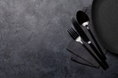 Zdjęcie "Pusty talerz, kubek, widelec, łyżka i nóż. Czarne naczynia kuchenne ustawione na kamiennym stole" może być wykorzystywane do celów osobistych i komercyjnych zgodnie z warunkami zakupionej licencji Royalty-free. Obraz jest dostępny do pobrania w jakości wysokiej rozdzielczości do 5760x3840.