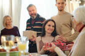 Uśmiechnięta młoda kobieta kładąca sałatkę na talerzu babci patrząc na nią przy świątecznym stole podczas rodzinnej kolacji