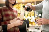 Zdjęcie "Szczęśliwa młoda kobieta i jej ojciec brzęczący kieliszkami wina nad serwowanym stołem na uroczystej kolacji rodzinnej w Święto Dziękczynienia" może być wykorzystywane do celów osobistych i komercyjnych zgodnie z warunkami zakupionej licencji Royalty-free. Obraz jest dostępny do pobrania w jakości wysokiej rozdzielczości do 5760x3840.
