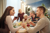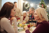 Dłonie szczęśliwej młodej kobiety i jej babci brzęczące kieliszkami wina, siedząc przy serwowanym świątecznym stole przy rodzinnej kolacji