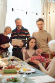Szczęśliwy dojrzały i młody członkowie rodziny toasting z winem na domowe jedzenie serwowane świąteczny stół podczas kolacji Bożego Narodzenia