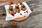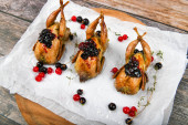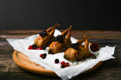 Gotowanie przepiórki na ciemnym tle. Na drewnianym tle. Niski klucz. Mały indyk