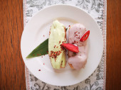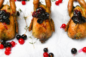 Przepiórka usmażona. Na drewnianym tle. Mały indyk. Zbliżenie.