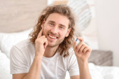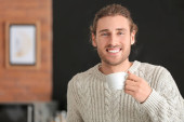 Przystojny mężczyzna z filiżanką kawy rozmawia przez telefon komórkowy w domu