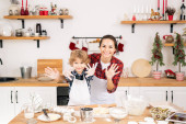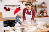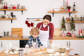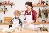 Cute boy i jego matka toczenia ciasta podczas gotowania domowe ciasto przy stole w kuchni