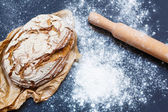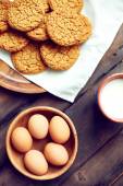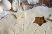 Taca z dwoma rzędami surowych ciasteczek świątecznych z trzema jajkami, wałkiem, mąką i przecinakami w pobliżu stołu